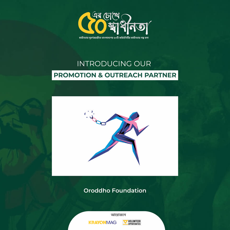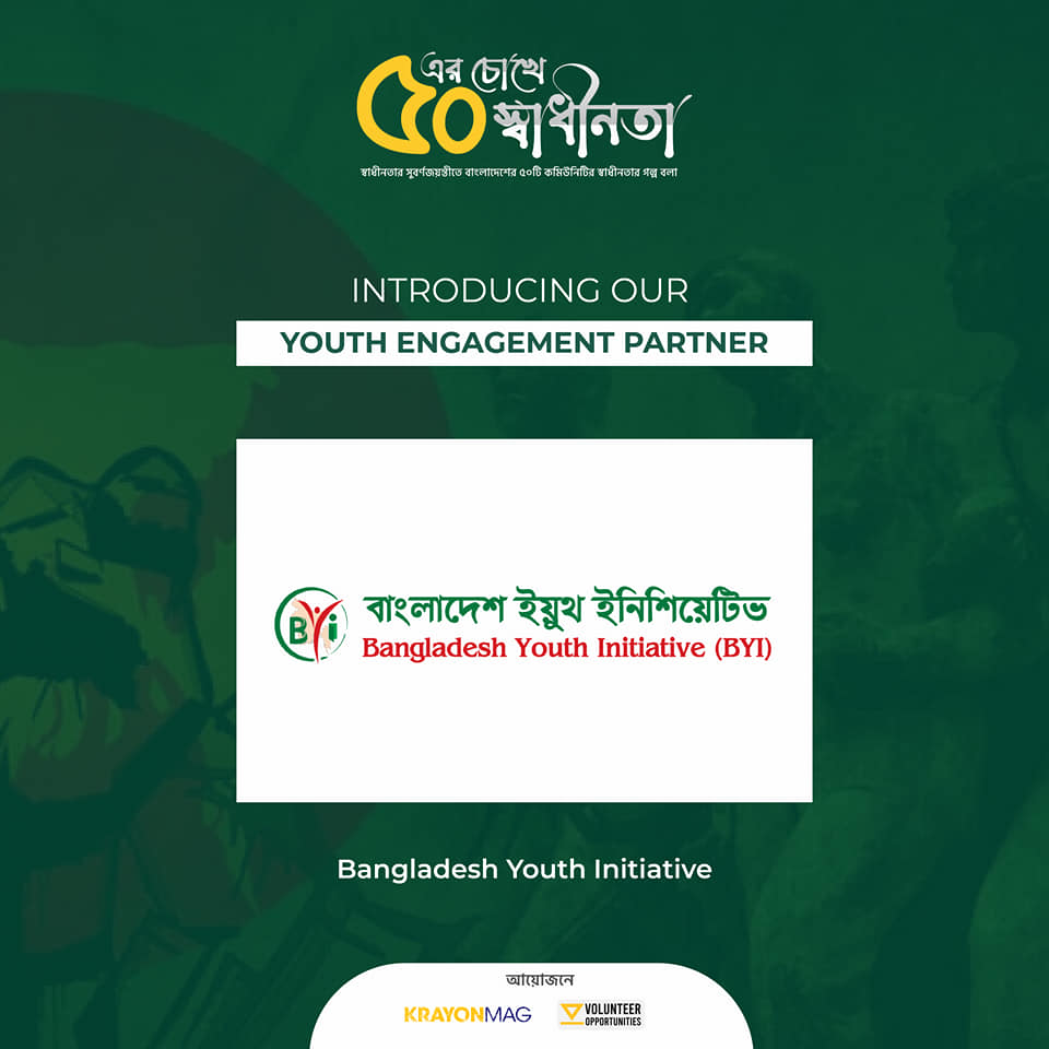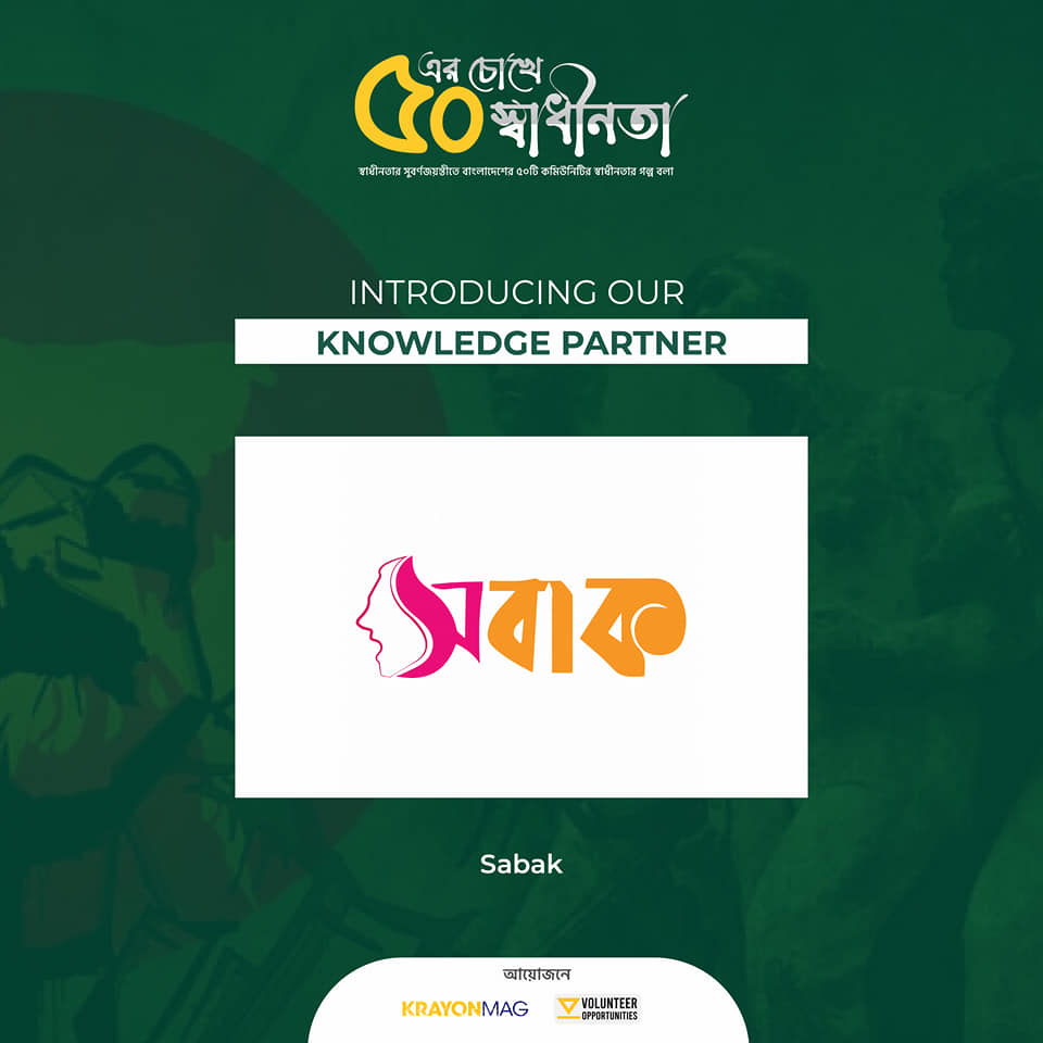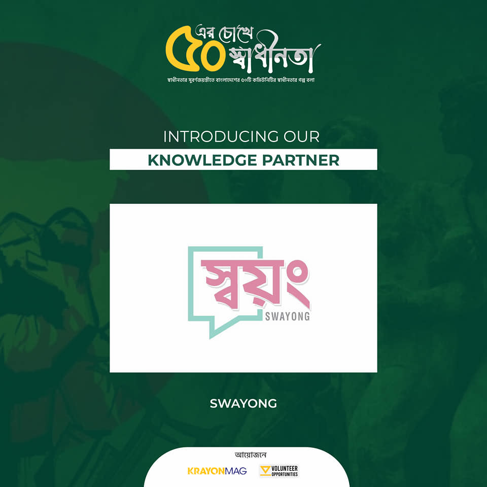 স্বাধীনতার সুবর্ণজয়ন্তীতে দেশের ৫০ টি কমিউনিটির স্বাধীনতার গল্প শুনতে চোখ রাখুন Volunteer Opportunities এবং KrayonMag এর ফেসবুক পেজে।