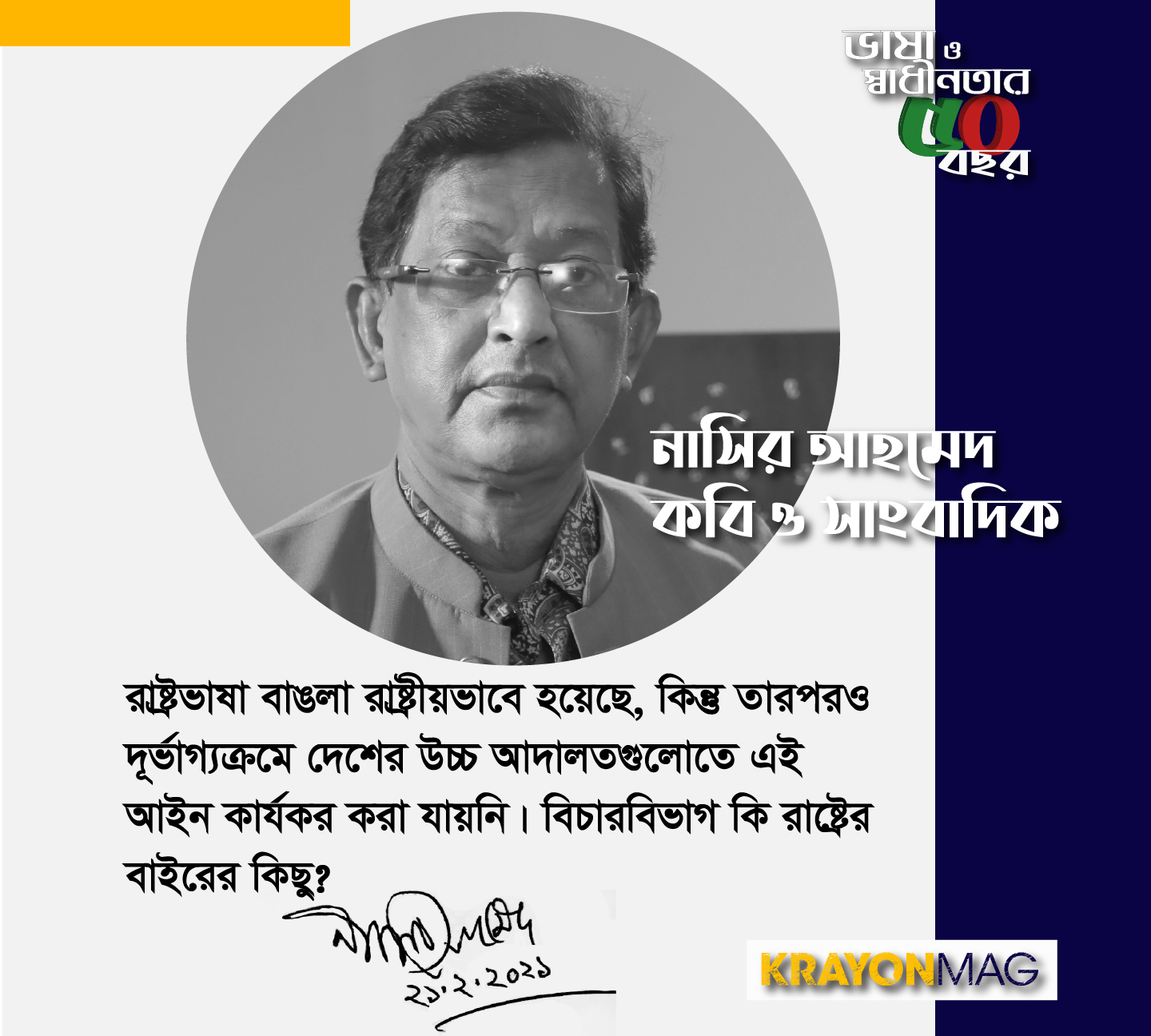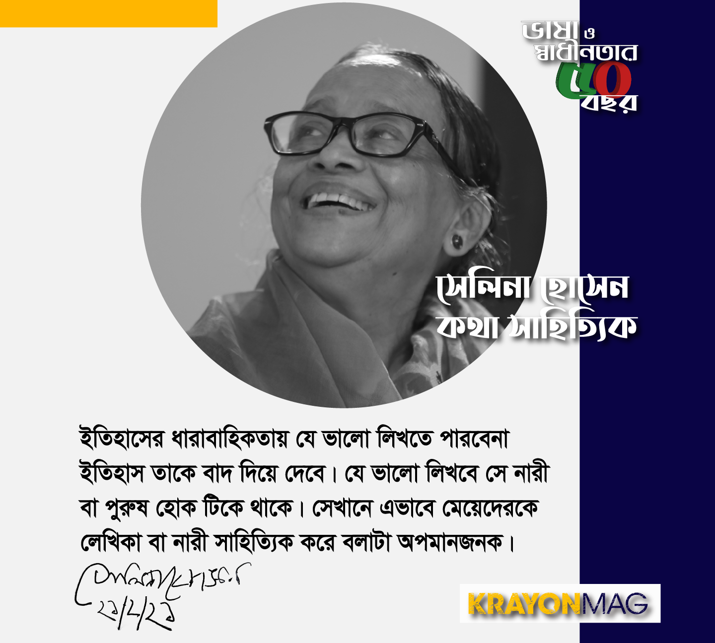 বাংলাদেশের স্বাধীনতার পঞ্চাশ বছর পূর্তি, একই সাথে বাংলা ভাষার ওপর বাঙালির রাষ্ট্রীয় ও রাজনৈতিক নিয়ন্ত্রণ প্রতিষ্ঠার পঞ্চাশ বছর। এই পঞ্চাশ বছরে বাংলা ভাষার বিবর্তন নিয়ে কি ভাবছেন গত পঞ্চাশ বছরে বাংলা ভাষার বিকাশে সাহিত্য, কবিতা, সঙ্গীত আর গণমাধ্যমে কাজ করে যাওয়া প্রথিতযশা পাঁচ পথিকৃৎ? বাংলা ভাষার বিবর্তনে তাঁদের অভিজ্ঞতা, অনুভূতি ও নতুন প্রজন্মের প্রতি দিকনির্দেশনা প্রভৃতি জানতে ক্রেয়ন ম্যাগের আয়োজন ‘ভাষা ও স্বাধীনতার পঞ্চাশ বছর’ এর ১ম পর্ব।